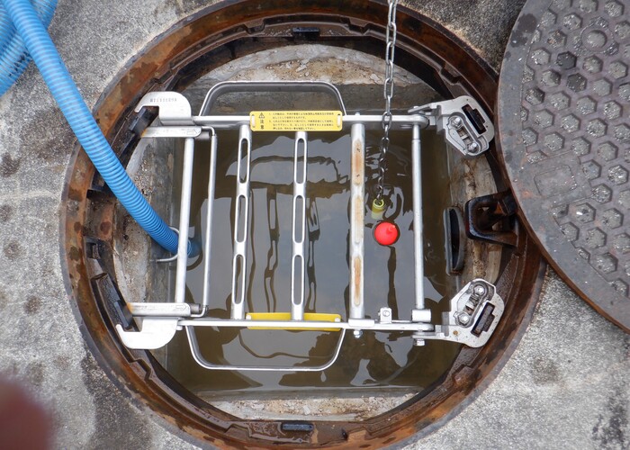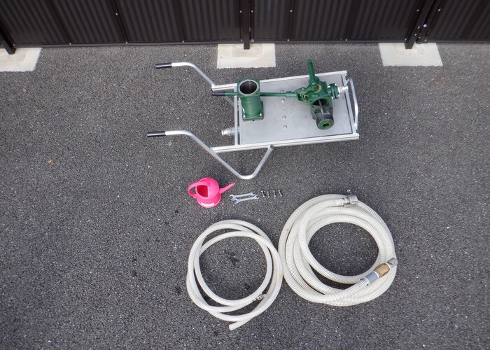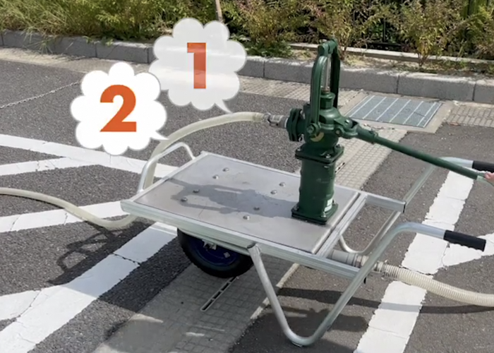 地下貯水槽の水を、手押しポンプにより汲み上げ、トイレ用水槽が満水時に栓を抜くと、溜まっている汚物を下水道本管へ流し込みます。
